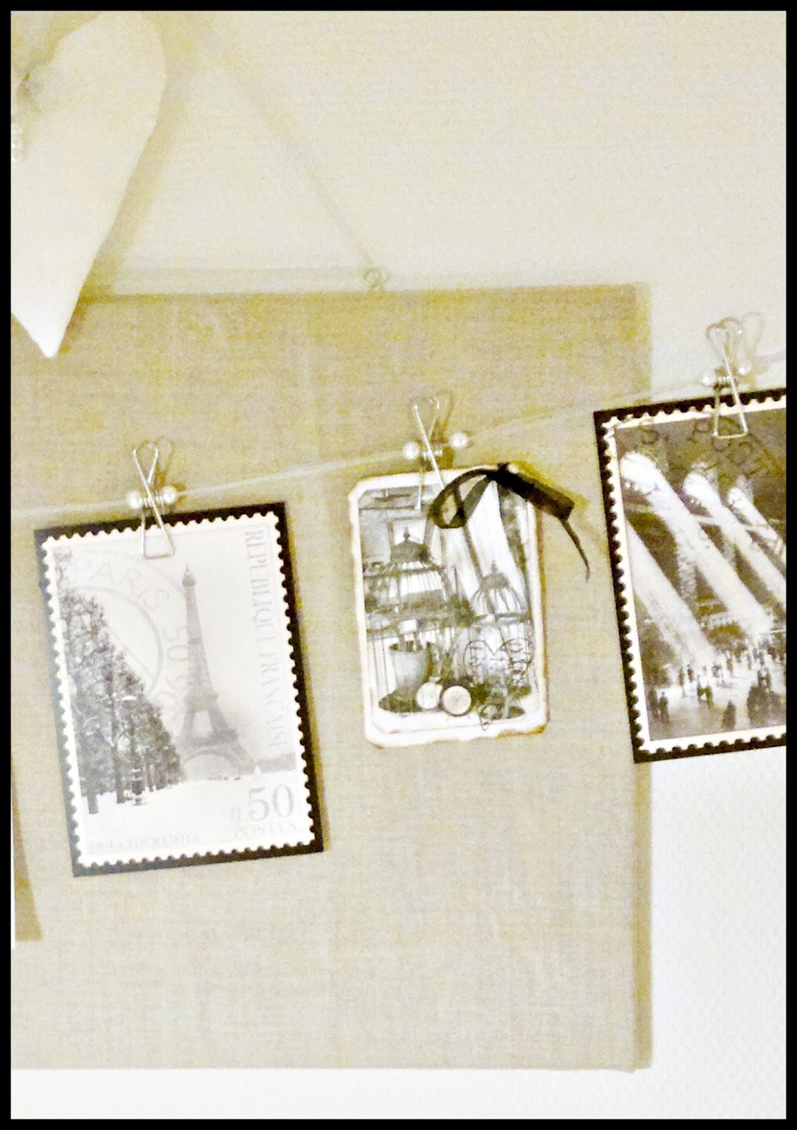 I love clips like this! These ones have been attached to the wall but you could just as well put up a string and attach them onto that. I've done that in my little office space and it works really well. You can see it in the picture below. The pearls keep the clips in place so they won't all pile up to the middle of the ribbon.